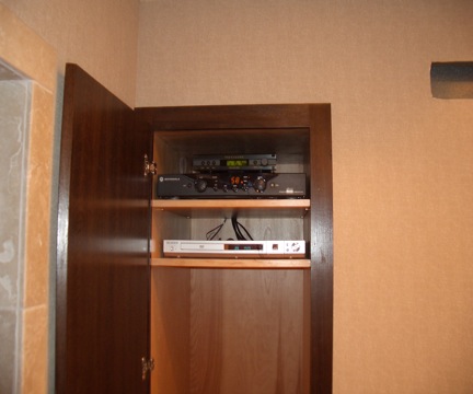 Hidden into the bathroom closet is the Cable box and DVD player for the Television